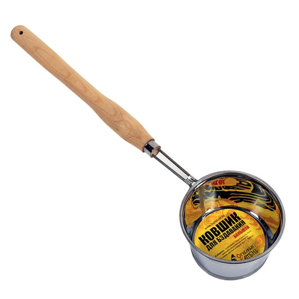 Ковшик - изготовлен из нержавеющей стали, при длительном использовании сохраняет свой первоначальный вид и не требуют замены. Эргономичная (приемистая) березовая ручка (36 см) специально разработана экспертами Компании. Такая форма ручки исключает проворачивание ковшика с кипятком в руке и обеспечивает безопасность парильщика.