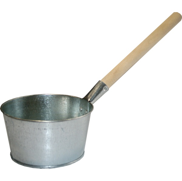 Ковш выполнен из оцинкованной стали, устойчивой к повышенным температурам, коррозии и повреждениям. Ручка выполнена из дерева, обработанного специальным водоотталкивающим составом. Объем ковша - 1,5 л.