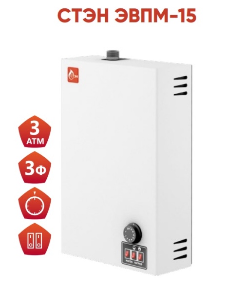 Электрокотлы СТЭН ЭВПМ-3,-6,-7.5,-9,-12,-15,-18 предназначены для отопления помещений площадью до 180 м.кв. Котлы оснащены механическим терморегулятором . В изделиях установлены ТЭНБ с ТЭН-ами из углеродистой стали , применен силовой блок на «тихих» силовых реле и двухступенчатая независимая регулировка мощности, предусмотрена возможность подключения насоса. Рабочее давление 3.0 атм. Баки котлов теплоизолированы.Для управления котлами по температуре воздуха в помещении рекомендуется использовать терморегуляторы РТВВ и РТВН . Гарантия на котел 1 год.