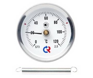 Термометр биметаллический накладной (термометр с пружиной) предназначен для измерения температуры поверхности трубы. Принцип действия термометров БТ основан на зависимости деформации чувствительного элемента от измеряемой температуры. В качестве чувствительного элемента используется биметаллическая пружина. Биметаллическая пружина изготавливается из двух прочно соединенных металлических пластин, имеющих различные температурные коэффициенты линейного расширения. При изменении температуры пружина изгибается и вращает стрелку термометра (биметаллическая пружина навита вокруг оси контактного элемента, а стрелка закреплена непосредственно на биметалле).