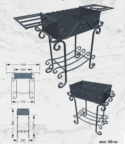 Мангал "Семейный" - одна из самых удачных моделей в среднем ценовом сегменте, сочетающая в себе высокие показатели качества с доступной ценой. В конструкции мангала используется конструкционная сталь марки Ст3 СП5 толщиной 3 мм, что делает эксплуатацию данного изделия удобной, практичной и эргономичной. Характерной отличительной особенностью данного мангала является то, что он имеет две крышки, выполняющие функцию закрытия мангальной части, а также подставок под решетку, шампуры либо посуду, необходимую при приготовлении. Это делает использование мангала очень практичным и эффективным: не нужно подбирать место под аксессуары, продукты и сопутствующие элементы барбекю. Важным дополнением и конструкторской находкой является раздельный на 2 части зольный ящик, который позволяет беспрепятственно удалять золу, а также перемещать мангал с его помощью по периметру участка. Стильная нижняя решетка, предназначенная для хранения угля, дров и растопочного материала делает мангал "Семейный" самодостаточным прибором, не требующего комплектации дополнительными элементами. Сборно-разборная конструкция дает возможность перемещать мангал в удобное место, а также хранить его в самых различных условиях, не занимая при этом много места. Ножки мангала в опорной части оснащены специальными упорами, создающими необходимую устойчивость на различных поверхностя