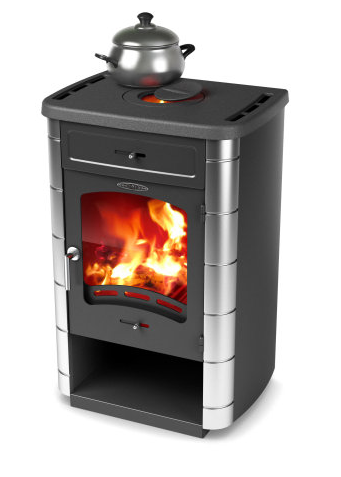 Печь сочетает в себе эффективный отопительный прибор, удобную варочную печь и красивый камин.
